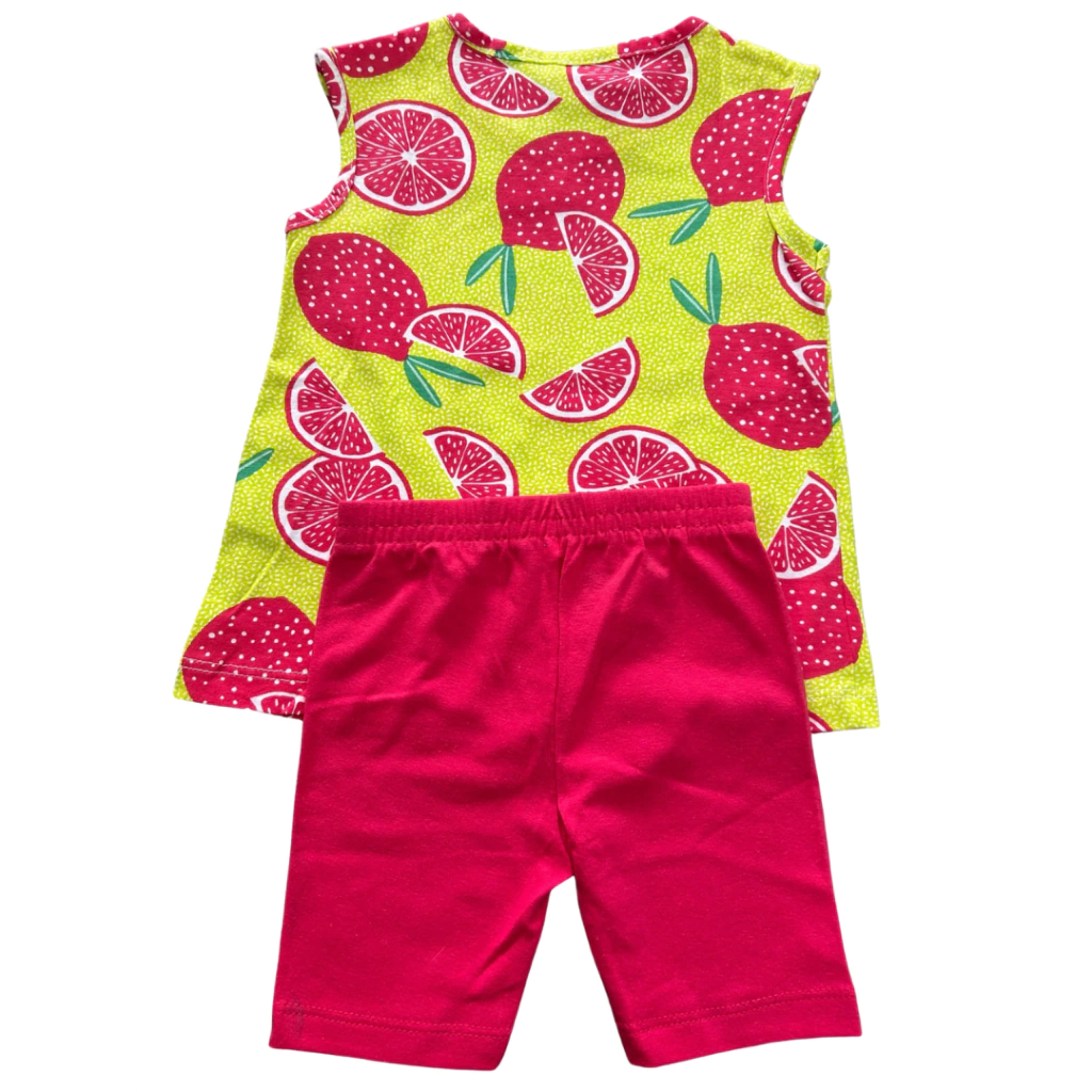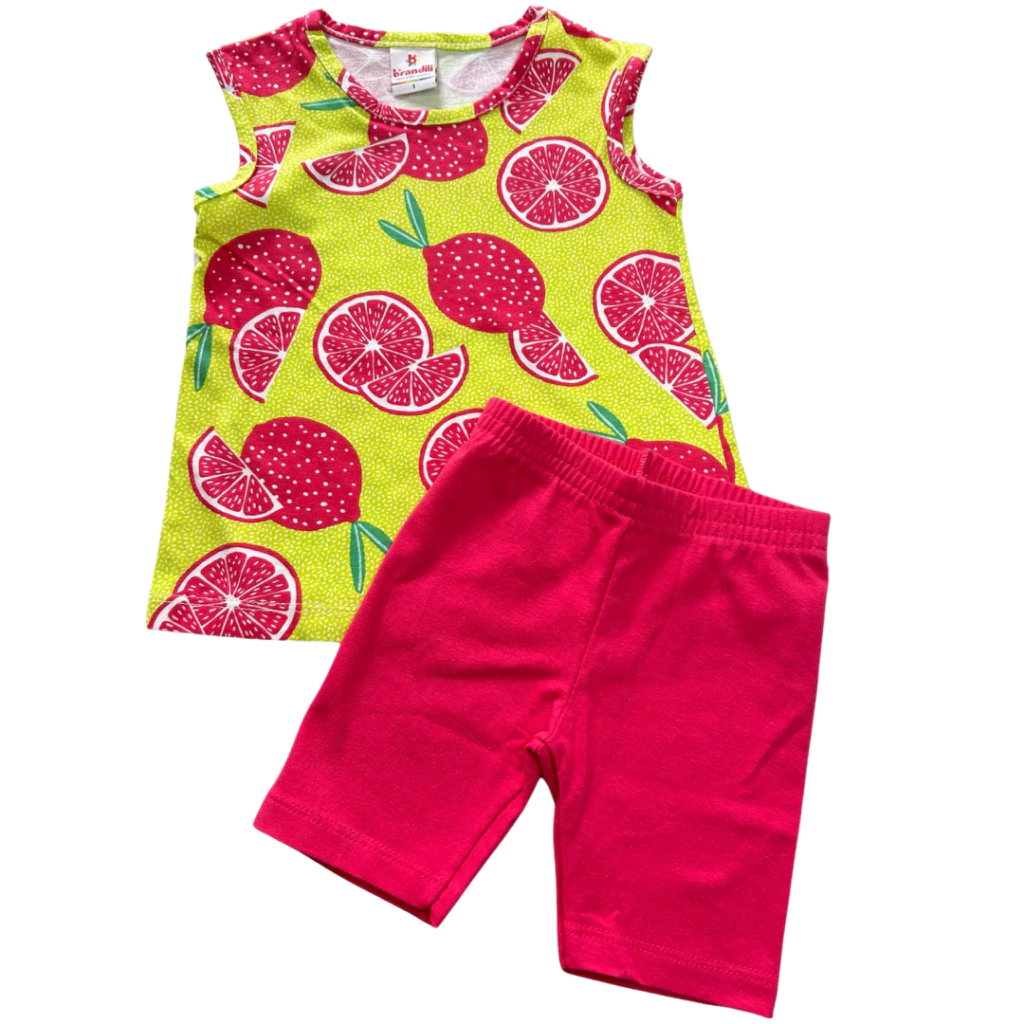 Conjunto Infantil Estampa Fruta Brandili é confeccionado em tecido algodão, composto por blusa e bermuda. Possui blusa com decote redondo, estampa fruta limão, sem manga; bermuda com cós elástico, acabamento e costura no tom.