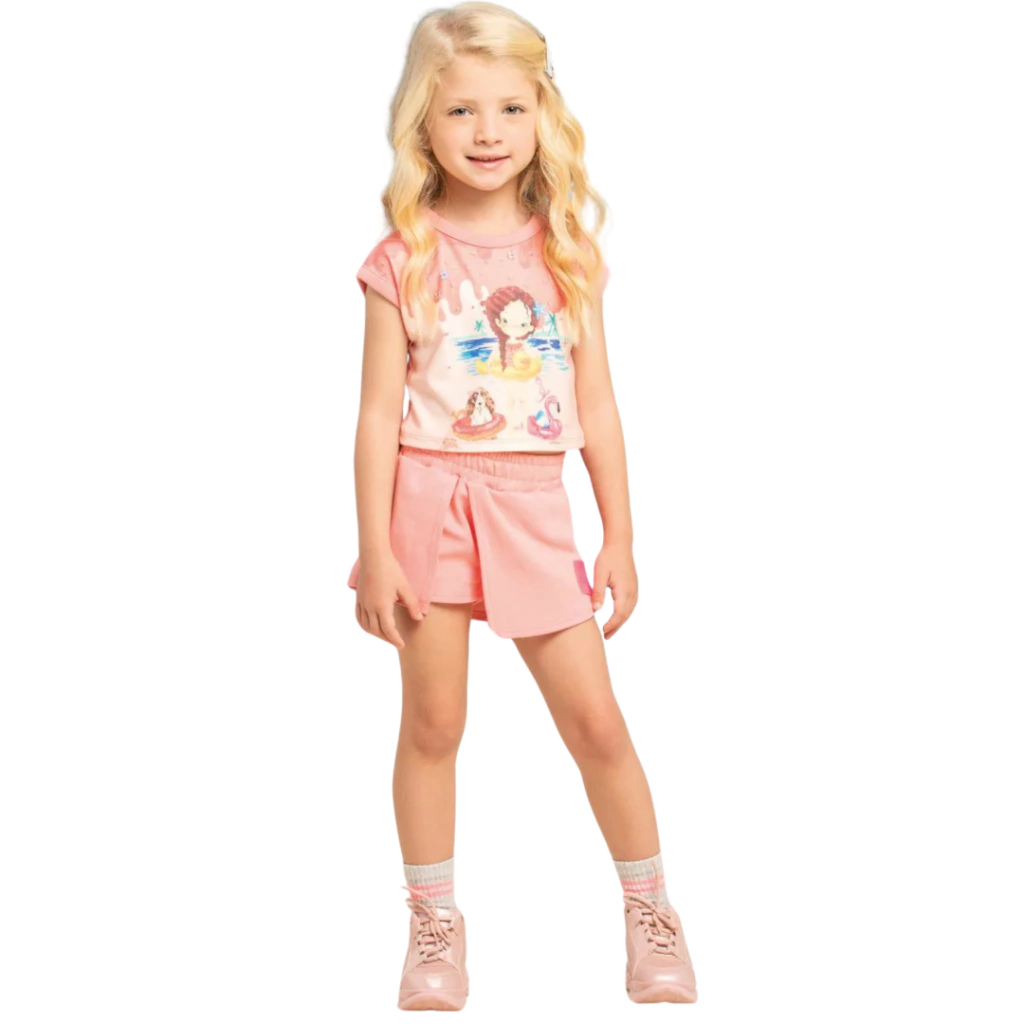 Conjunto infantil milli & nina composto por blusa em interlock allure e crepe, com shorts em interlock allure. possui duas opções de ilustração nas variantes. look fresquinho para os dias quentes de verão.