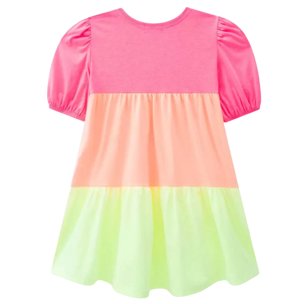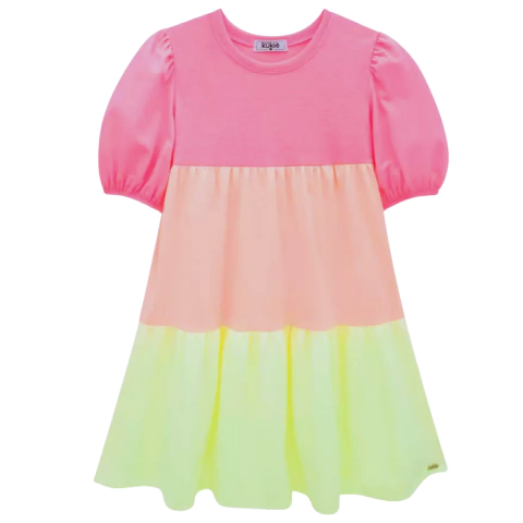 Vestido em meia malha , com recorte em 3 cores neon (rosa, laranja e amarelo), mangas bufantes e gola redonda
